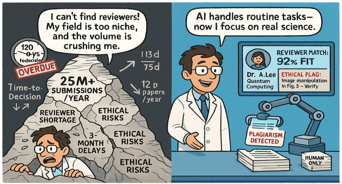 The crisis in peer review does not represent a system fail- ure, but rather reflects a model designed for a pre-digital era. Artificial intelligence does not replace reviewers but enables them to focus on the most intellectually relevant tasks. By automating repetitive processes, increasing pre- cision, and expanding participation, AI can help restore scientific evaluation’s credibility and accelerate knowl- edge advancement. The future of science does not belong exclusively to humans or machines, but to their strategic collaboration. In this new ecosystem, knowledge integrity will depend on hybrid systems capable of responding re- sponsibly to the challenges of the information age.